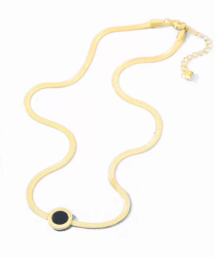Make a statement with this elegant golden chain, perfect for elevating any outfit. The chain is made from durable stainless steel titanium, ensuring it will last for years to come. The black round pendant adds a touch of sophistication and completes the look. Whether you’re dressing up for a special occasion or just want to add some glam to your everyday style, this chain is a must-have accessory.